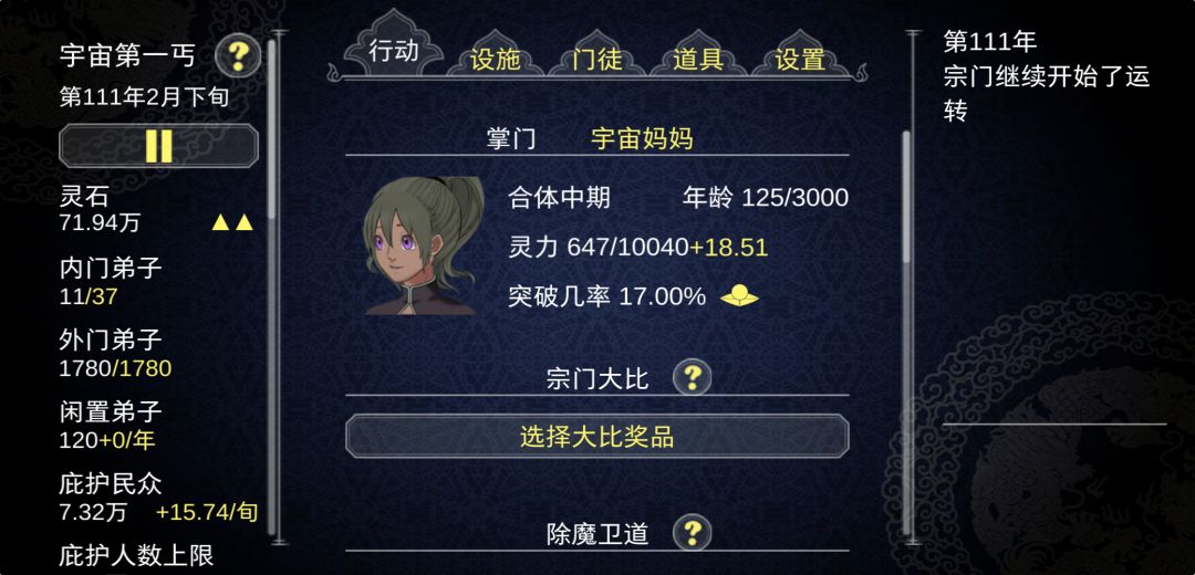 其实可以把宗门、除魔、炼丹和制法宝放置在右边操作中间看信息不是更方便一点么,而且这个游戏更多的乐趣不就是看突发事件,这样个人感觉体验更好。