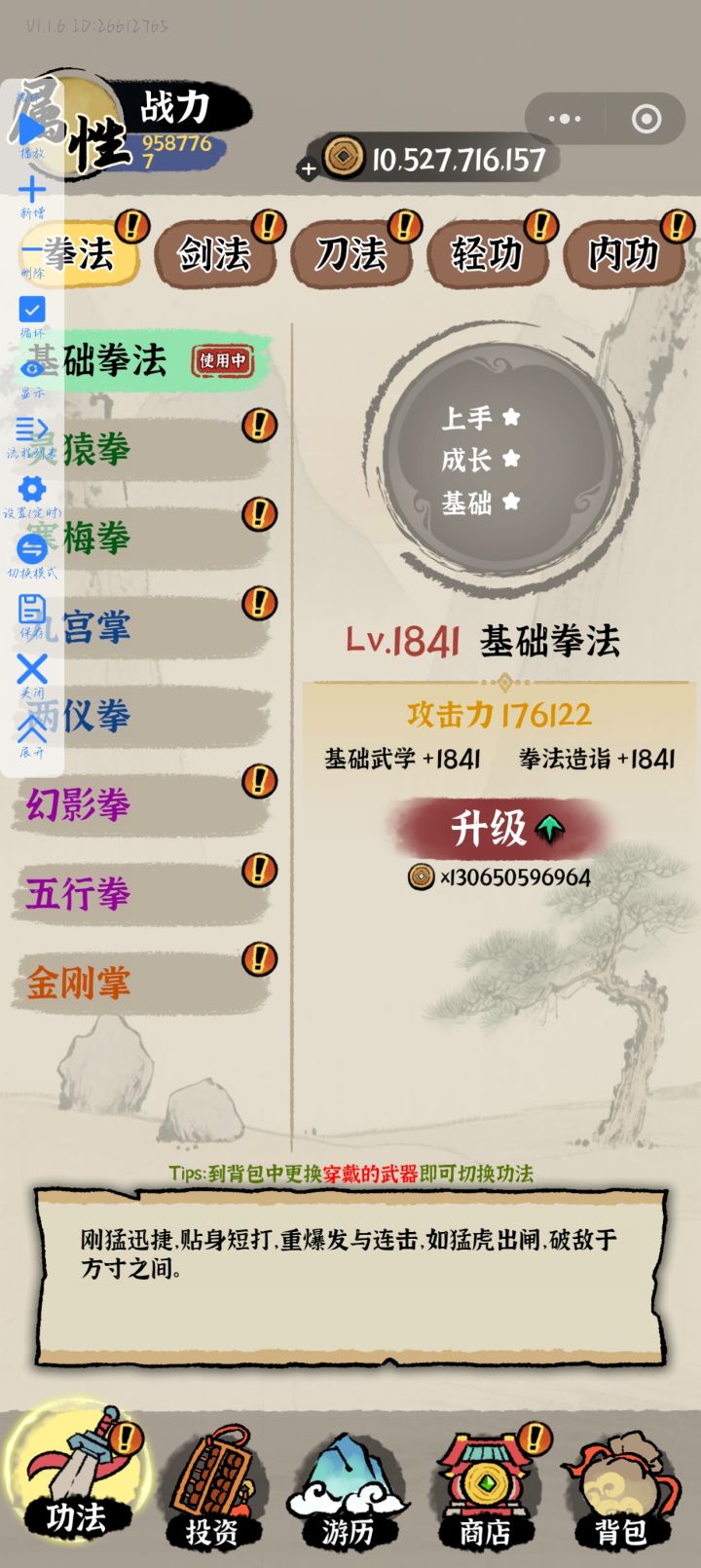 昨天更新的内容后宫,世界boss和擂台赛今天没有了,应该是卡bugd了,后续不知道会不会继续推出,卡bug期间,无广告版,我发现了一个误区,不要升级高品质的武功功法,升级基础的,500级之后会发生质变,并且基础功法不受武学基础限制[表情_吃瓜]