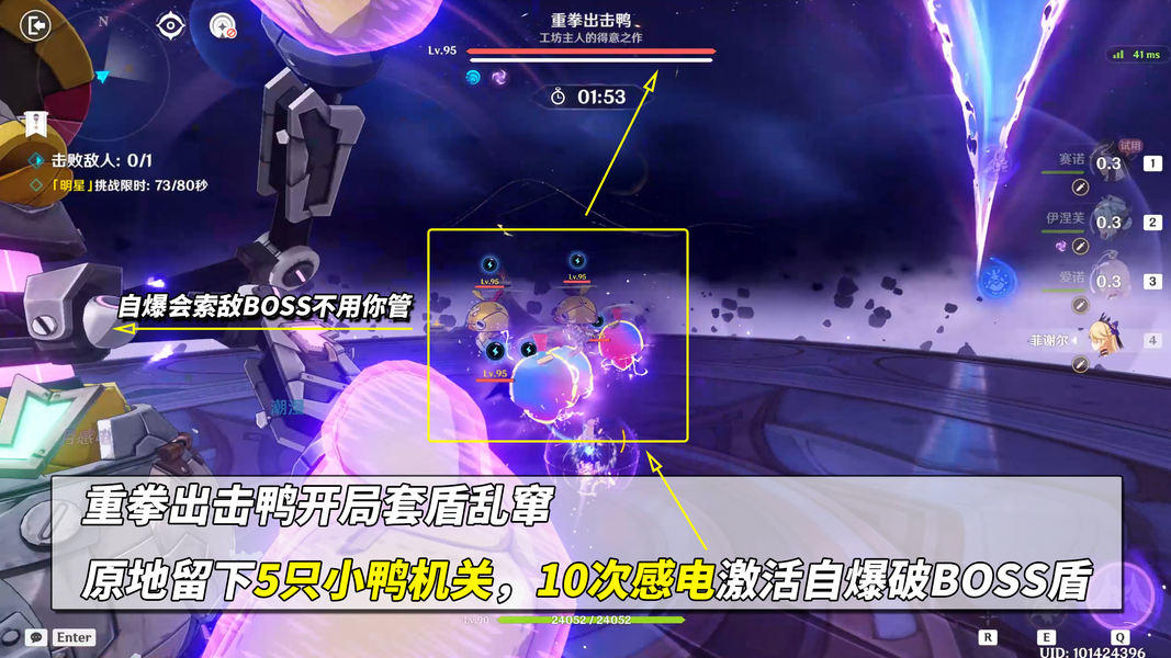 第八幕「重拳出击鸭」无特殊抗性。开局会生成护盾并召唤5个聚在一起的小鸭机关,10次感电反应可激活小鸭机关炸BOSS。