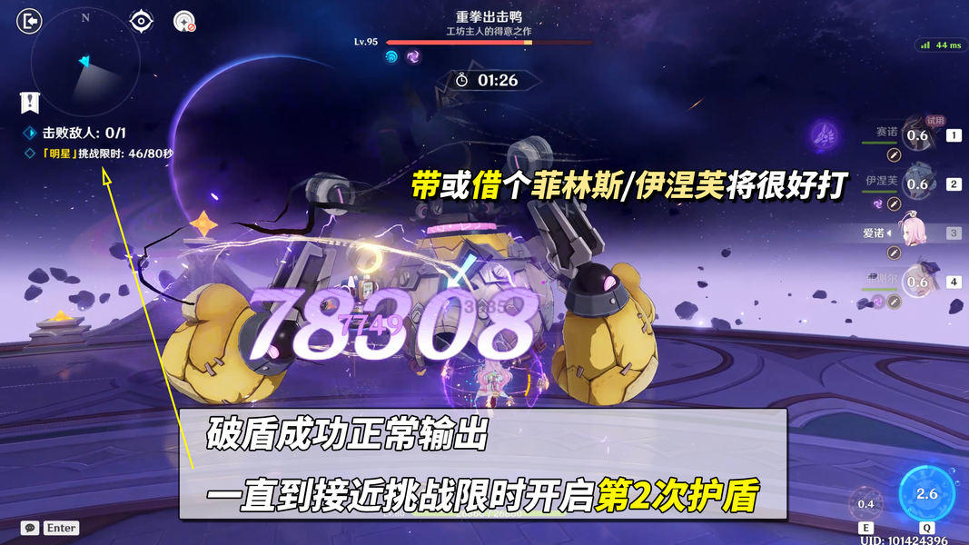 5只全爆,BOSS瘫痪15秒,抗性变成负50%。随后以无盾状态一直持续至“接近明星挑战限时结束”开启第二次护盾。如果大家有菲林斯或伊涅芙,非常好打,没有也可以考虑找好友助演借一个,实在不行考虑范围挂水+范围挂雷也能打。