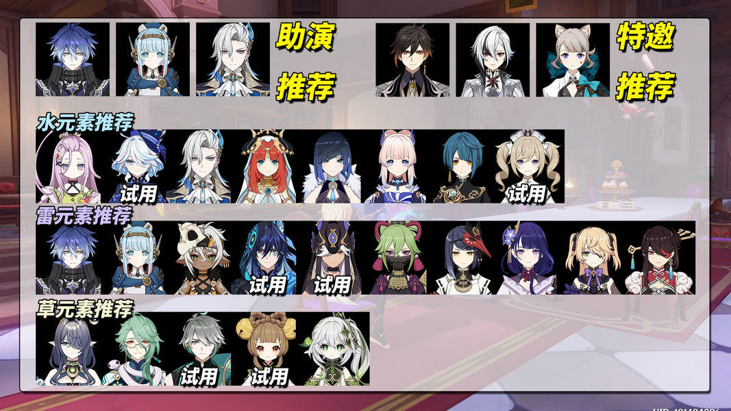 「水」爱诺、芙宁娜(试用)、那维莱特、妮露、夜兰、心海、行秋、芭芭拉(试用)。