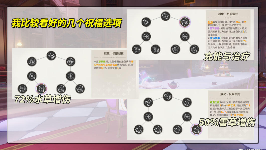 「辉彩祝福·推荐」感电“初阶雳云”获得治疗与充能;绽放“极限凝核”72%水草增伤;激化“极限丰茂”50%雷草增伤。