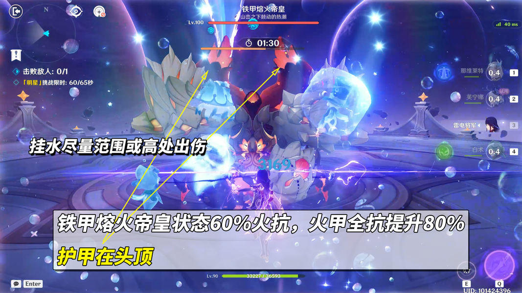 第十幕「铁甲熔火帝皇」常态60火抗,头顶双角火护甲存在时全抗提升80%。机制很纯粹,带挂水角色给它火甲破了(那维莱特/芙宁娜/心海/行秋等等),直接就变成原地挨打的桩子了。