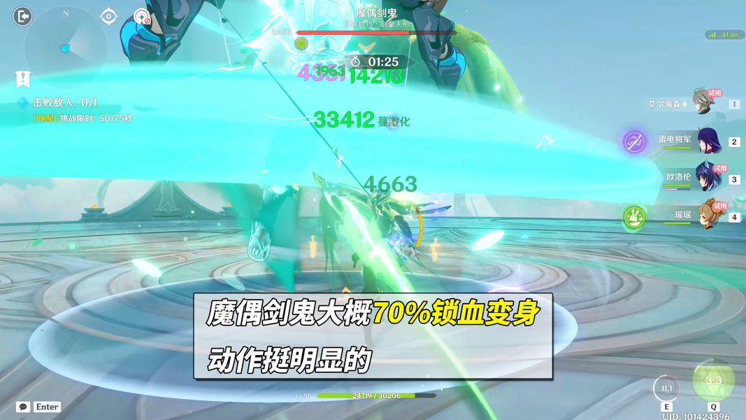 ②血量70%左右锁血变身,不用特意观察血条,当它手中由物理单剑变成冰风双剑时,将会锁血蓄力顿地造成冰风混伤;