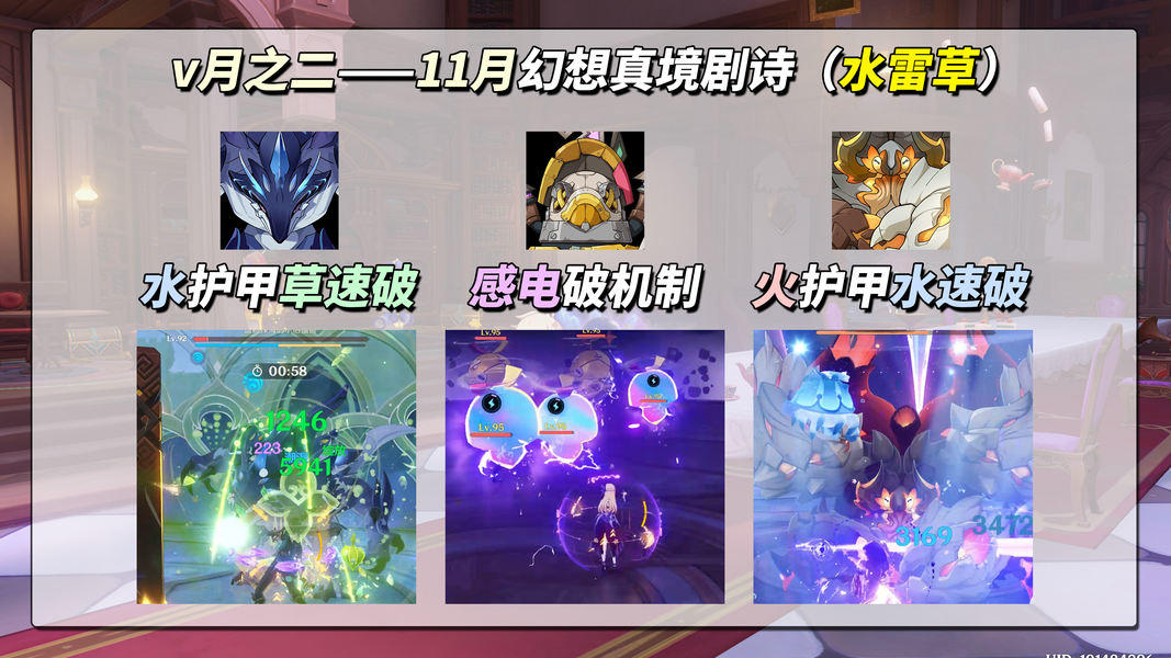 最新一期「11月·幻想真境剧诗」更新,此次元素限制为“水、草、雷”,如果我没记错,已经连着9、10、11月这三期都给了水元素,配队可太自由了!难度方面,11月幻剧对比上期也要简单不少,机制怪不多且容易处理,接下来就由冻梨分享一下我的选角建议以及对敌技巧~