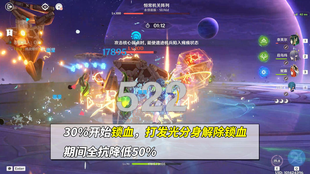 圣牌挑战二「恒常机关阵列」无特殊抗性。血量降低至于30%开始锁血,分裂召唤遗迹机兵,消灭被光带包围的特殊机兵,即可让BOSS解除锁血,并全抗降低50%。