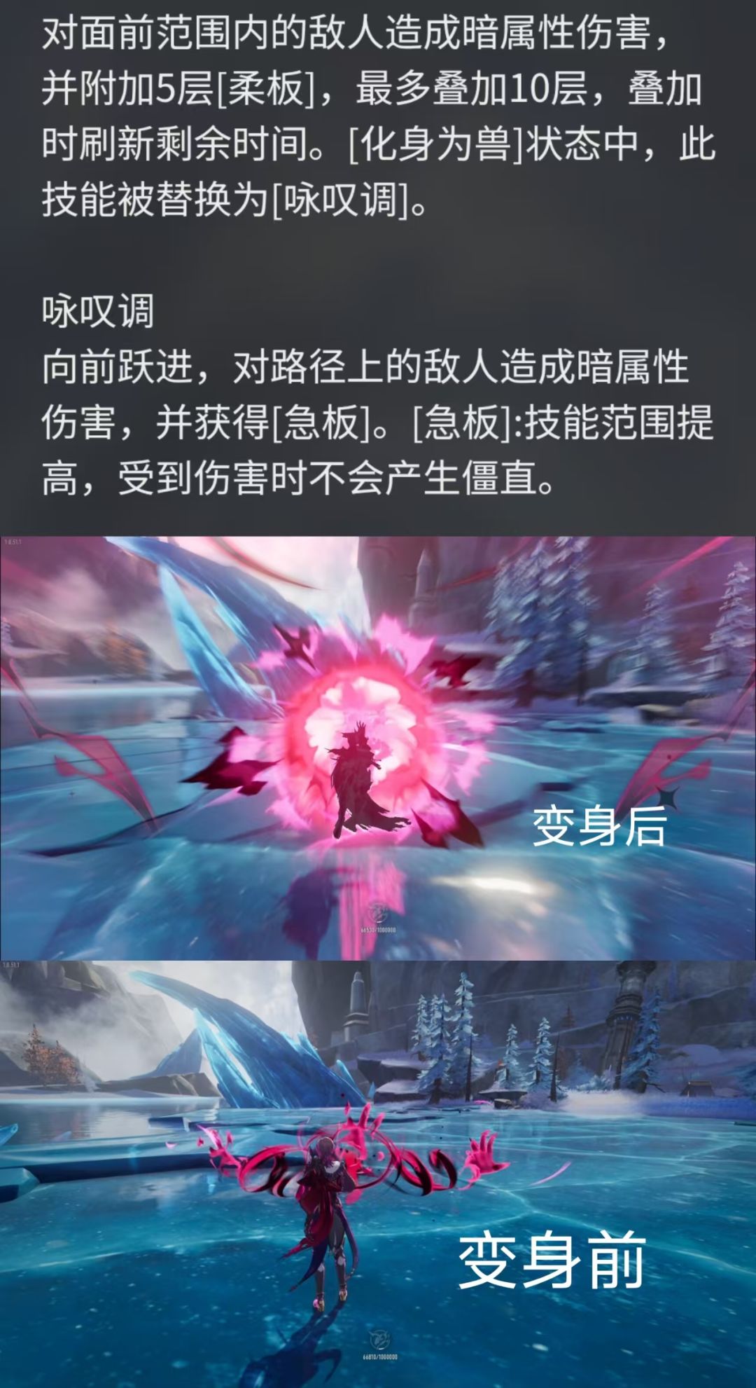 开大变身之前和变身后,小技能不一样。变身后攻击方式为爪子抓挠,远程放激光,变身后小技能螺旋跳,下落攻击。