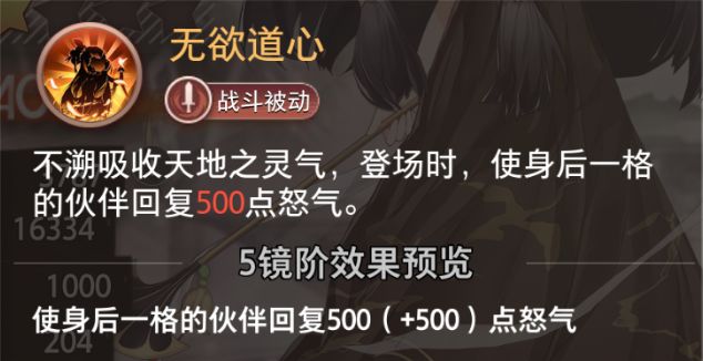 被动·无欲道心:登场时,使身后一格伙伴回复500点怒气(5镜阶+500)。关键作用是加速主C/核心开大,放在主c前面,