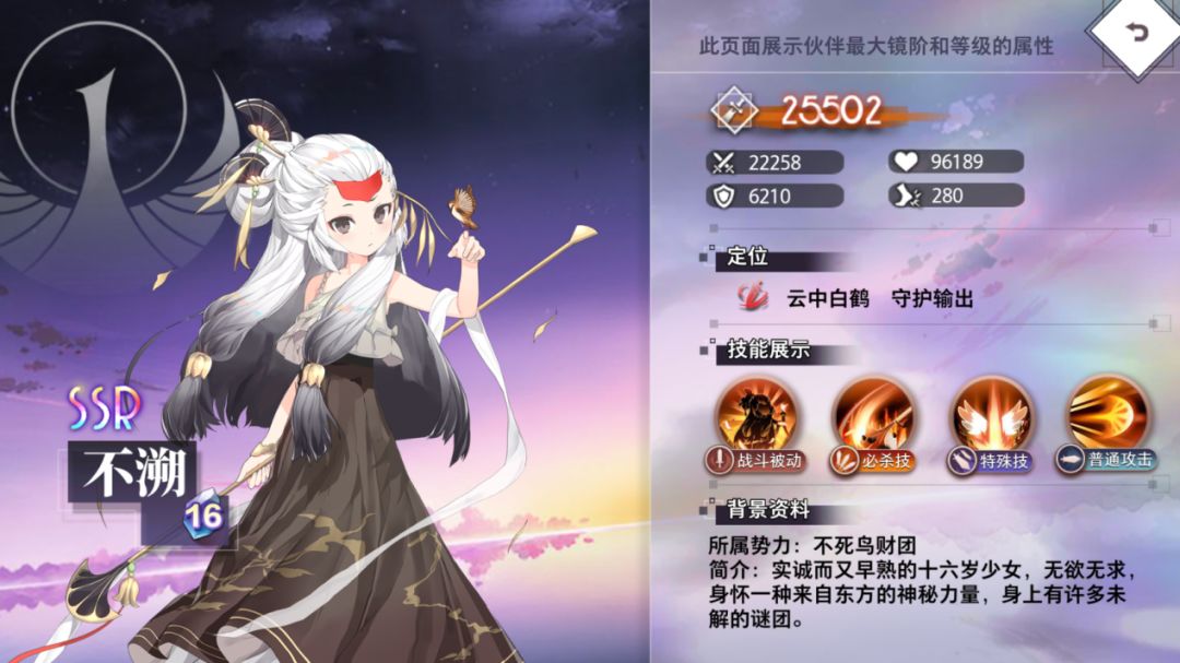 必杀技·圣谕裁决:对单个敌方单位造成攻击285%伤害(4镜阶+70%),同时为生命最低的己方伙伴恢复全部生命。6镜阶强化为:为生命最低友方恢复攻击120%的生命。