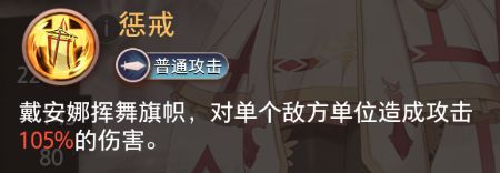 普通攻击·惩戒:挥舞旗帜对单个敌方单位造成攻击105%伤害,清杂兵或补刀用。