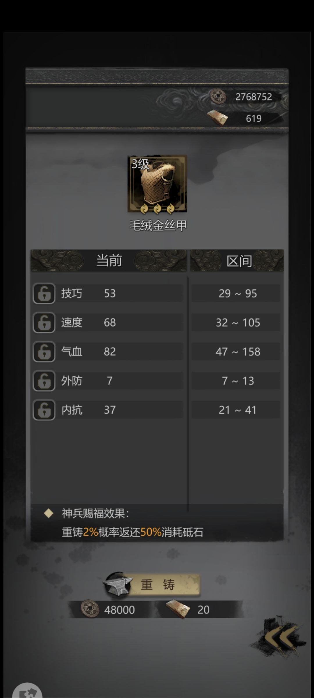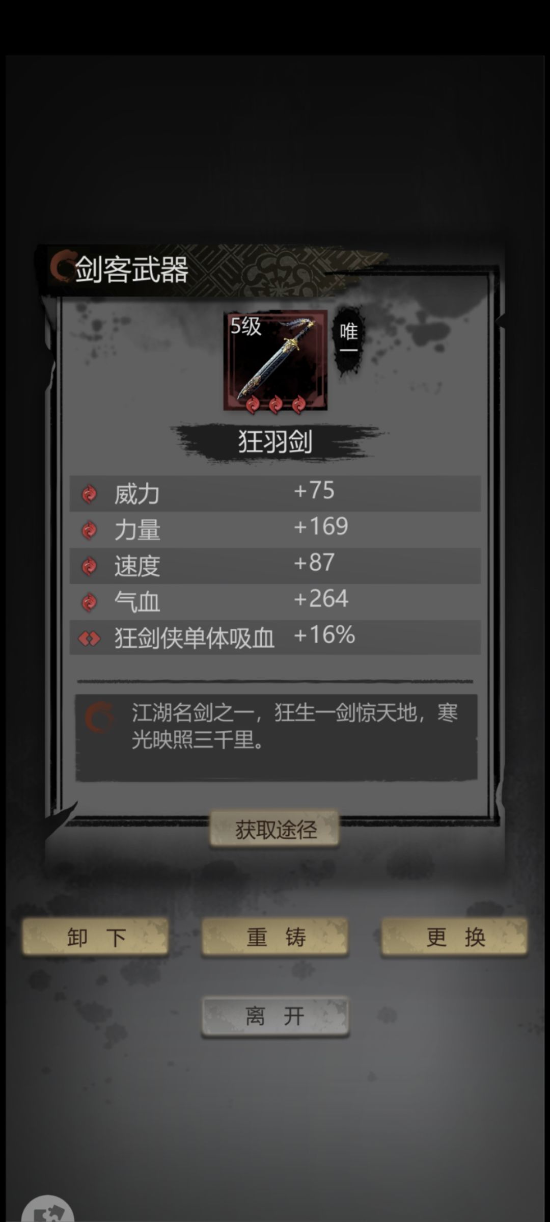 ,确实一部分运气好,暴力多(我没带加暴击珍品)另一部分中间也调整了几次装备,写一点心得首先吸血还是能多高就多高,简单算一下大概多1%就能多撑一刀,以我的练度来说,饮血能在2分钟以后死才有可能过。武器属性我也放这了,洗了180石头感觉洗的也挺一般,实在是榨干了。那两个配件的话,我感觉用双面具比较好,加气血和力量,都是有用词条,配队一那个鞋子有速度也能用,仁者见仁智者见智了,自己调速打一打试试。衣服绝对是重中之重,我济世加的内抗不够,我就去找了下有什么可替代的,然后发现第九章探索给的那个金丝甲竟然加的内抗最多,于是 洗了一个高内抗的很快就过去了。还有济世用手串比较好点,同时加技巧和内力。