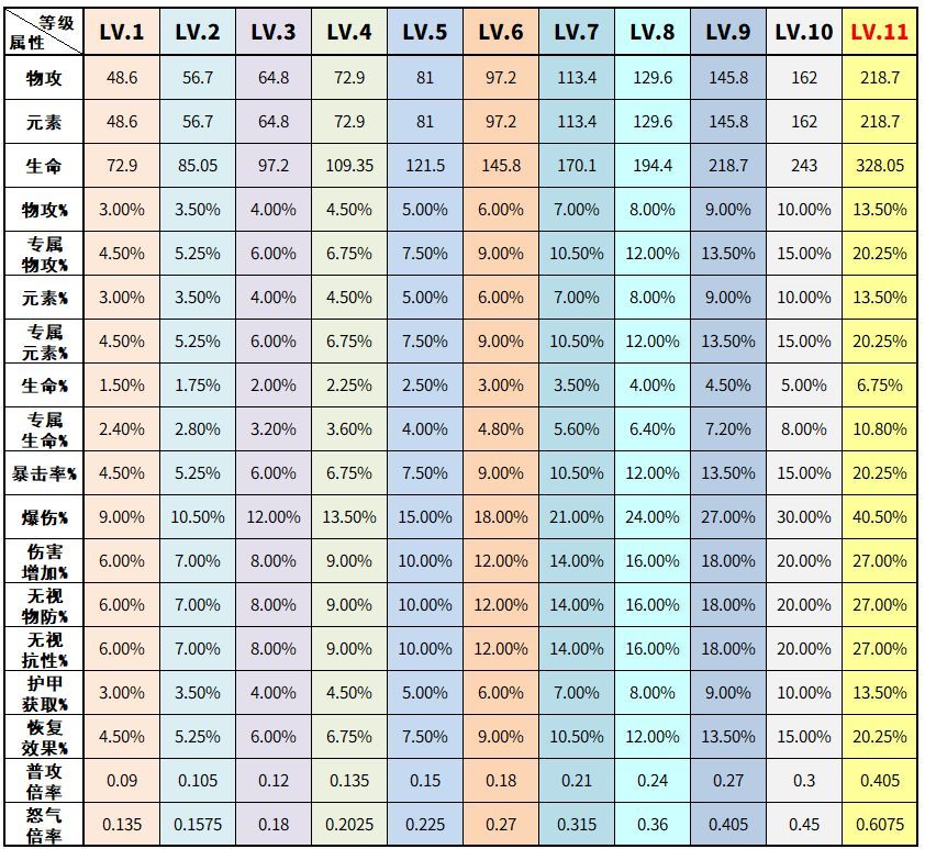词条等级对应属性见下表,表内数值为该等级满值数据,因装备本尚未完全做完(专属和护甲获取)未实装,下表仅做参考
