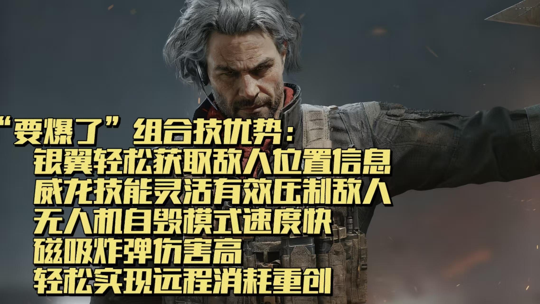 这套组合技的配方非常简单,只需要银翼启动他的“猎鹰无人机”,再加入几个威龙的“磁吸炸弹”就可以完成我们的“要爆了”组合技。这个时候有的彦祖和亦菲就会问,这两个技能分开我都认识,怎么合起来看不懂了呢?兔桑在这里告诉大家,银翼的猎鹰无人机其实是一个实体单位,超高伤害的磁吸炸弹就可以完美地吸附在无人机上面——看到这里大家也都明白了,就是靠着银翼的无人机带着威龙的磁吸炸弹飞向敌人达成远距离无伤消耗的目的;如果我们距离把控到位,敌方遇到这一套组合技那不是回到特勤处就是等着队友扶。