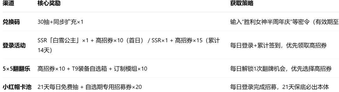 零氪党:通过兑换码+登录活动可获75抽,配合卡池免费抽保底获取小红帽本体。