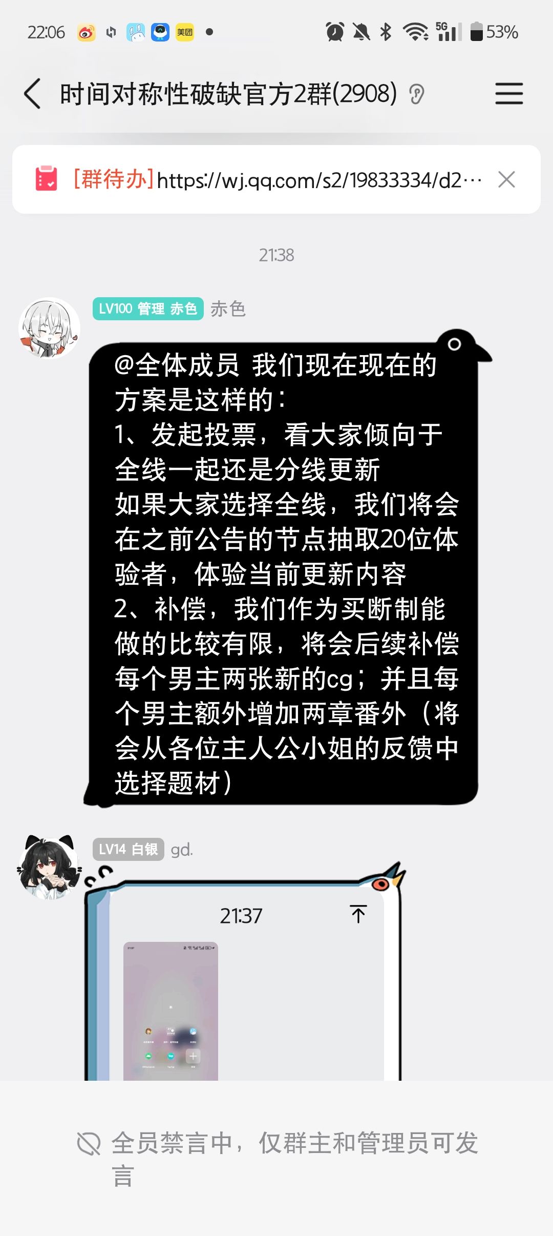 具体上线时间是不公布的,不看群是不知道今晚9:10才能下载的,腾出时间和心情准备今晚打完所有线,结果临上线之前一小时跟我们说,包体炸了,而且还突然间说要间隔一周才能更新所有男主的线666,你不守信用的情况太多,我已经不知道你这是真的有问题,还是在一直溜我们?是不是没做完?还有你那灾难级别的公关,无力吐槽,制作组灵机一动说抽二十人体验,我声音再尖锐一点,你一个买断制游戏,整天抽这抽那,到底要干什么?何意味?逆天这块,知不知道什么叫小惠未遍民弗从也?