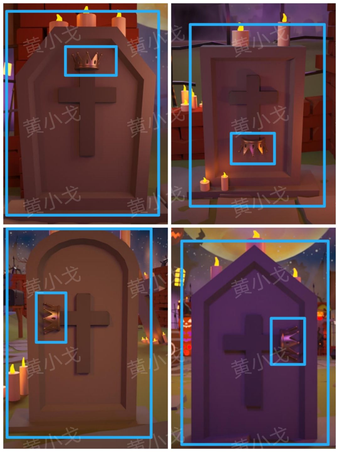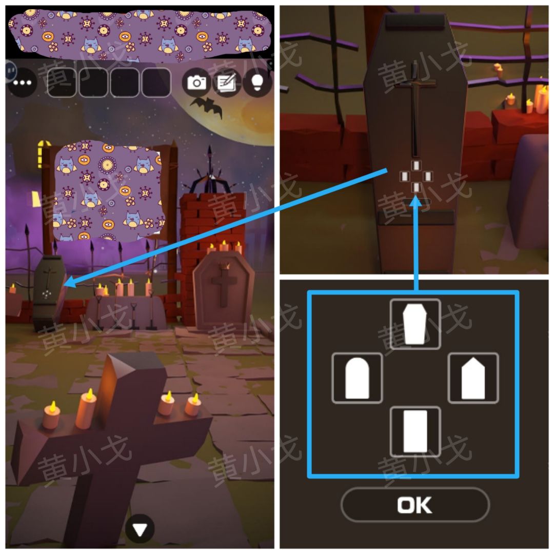 19.点击左后方棺材上的密码锁,根据四个场景墓碑形状和皇冠在十字架上的位置,调整密码锁