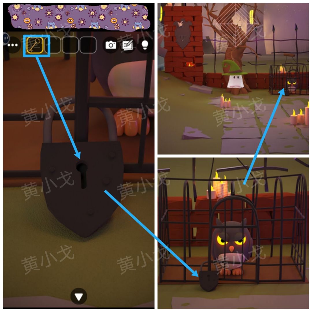 35.点击鸟笼上的锁,用【钥匙】打开,放飞猫头鹰
