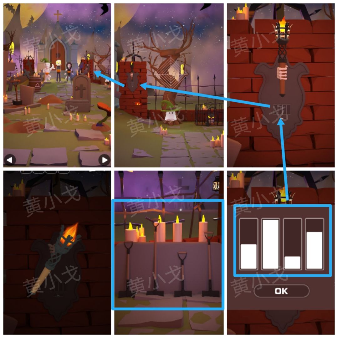 8.点击右后方墙上的机关,根据[修女]场景铲子高度线索,调整机关,获得【火把】