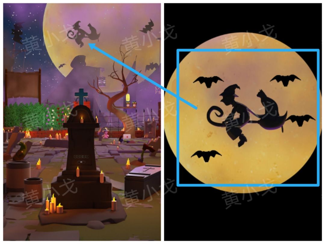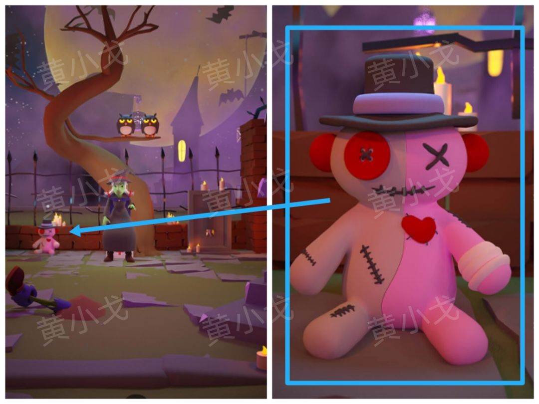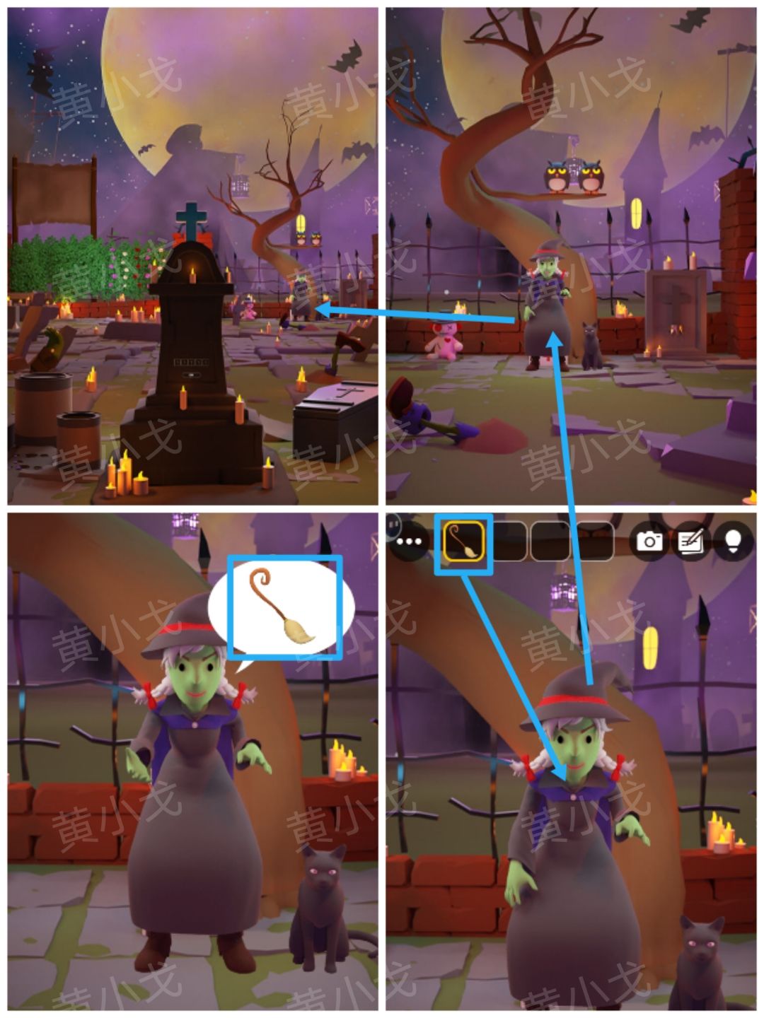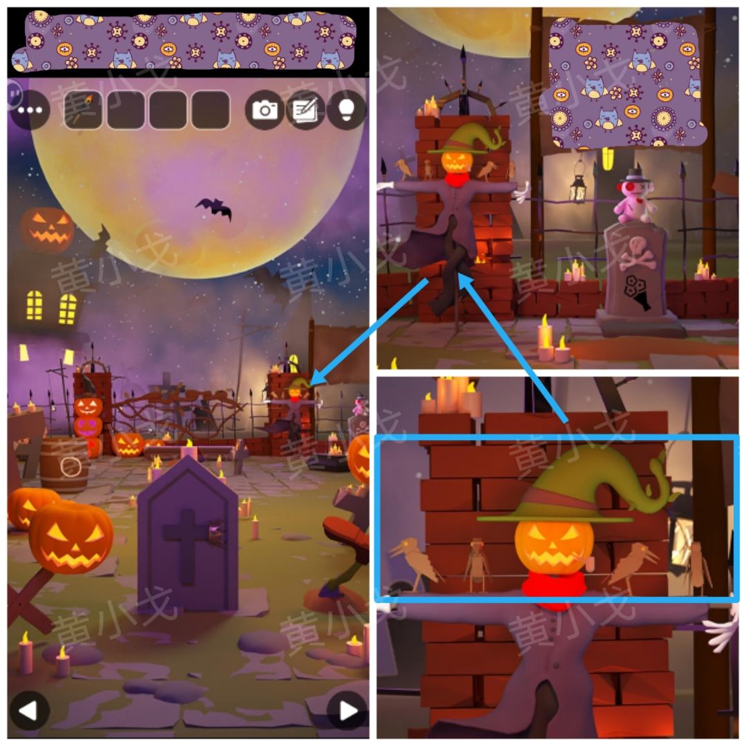 28.根据[南瓜]场景稻草人手臂上的木鸟朝向,调整四个骷髅头的朝向,获得【魔法扫帚】
