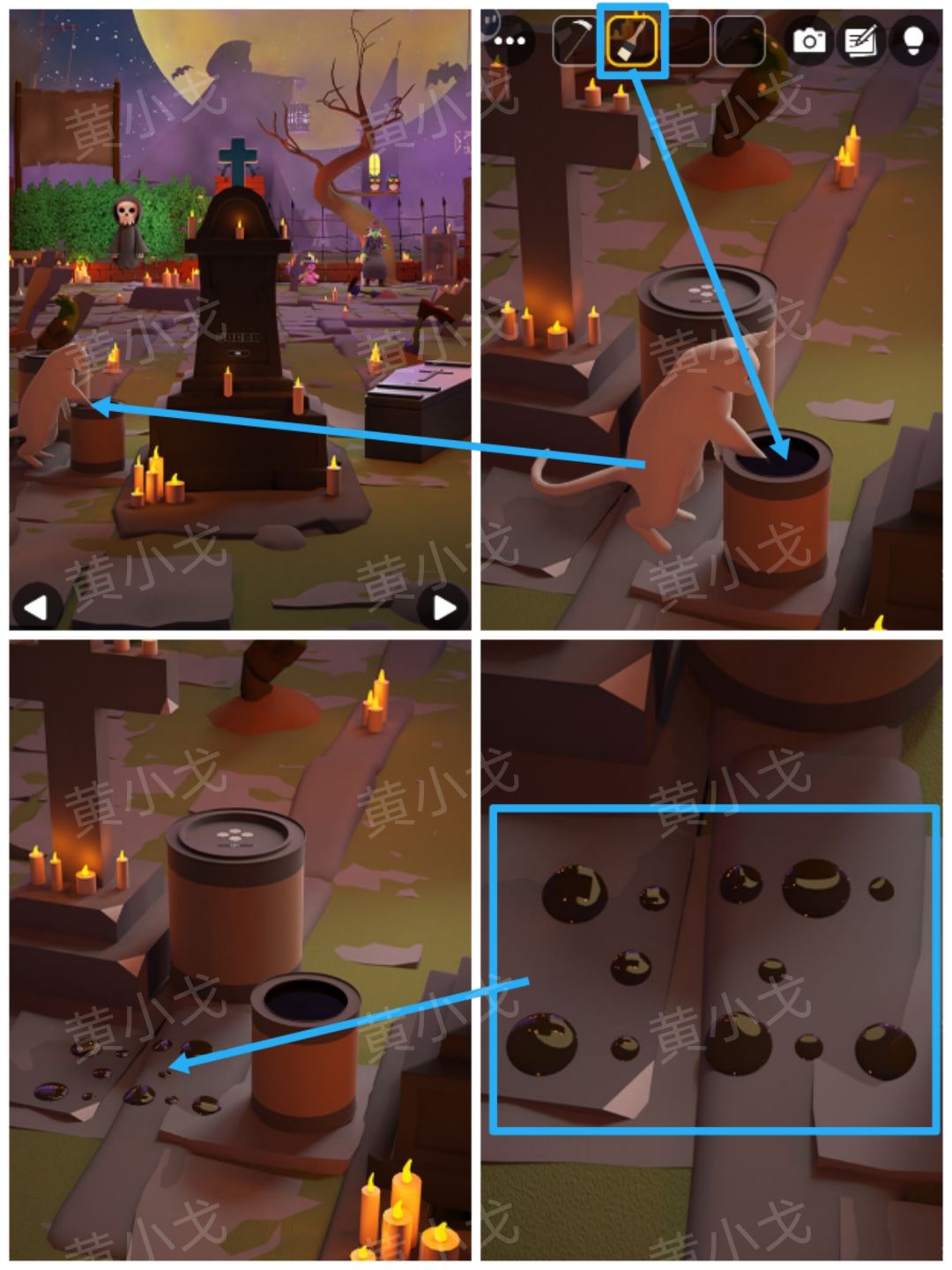 23.用【刷子】给小猫涂上黑色颜料;查看滴落的颜料,获得线索