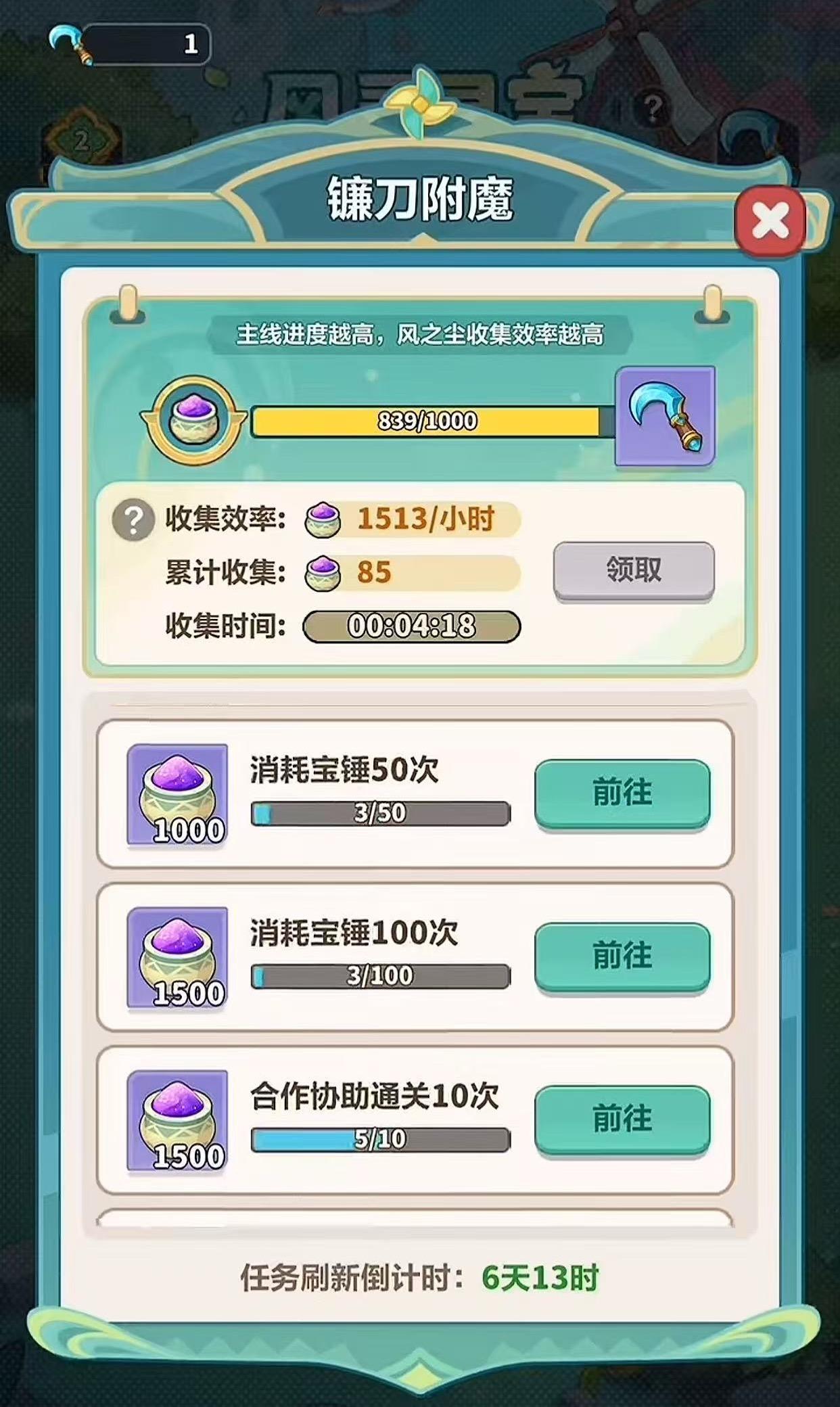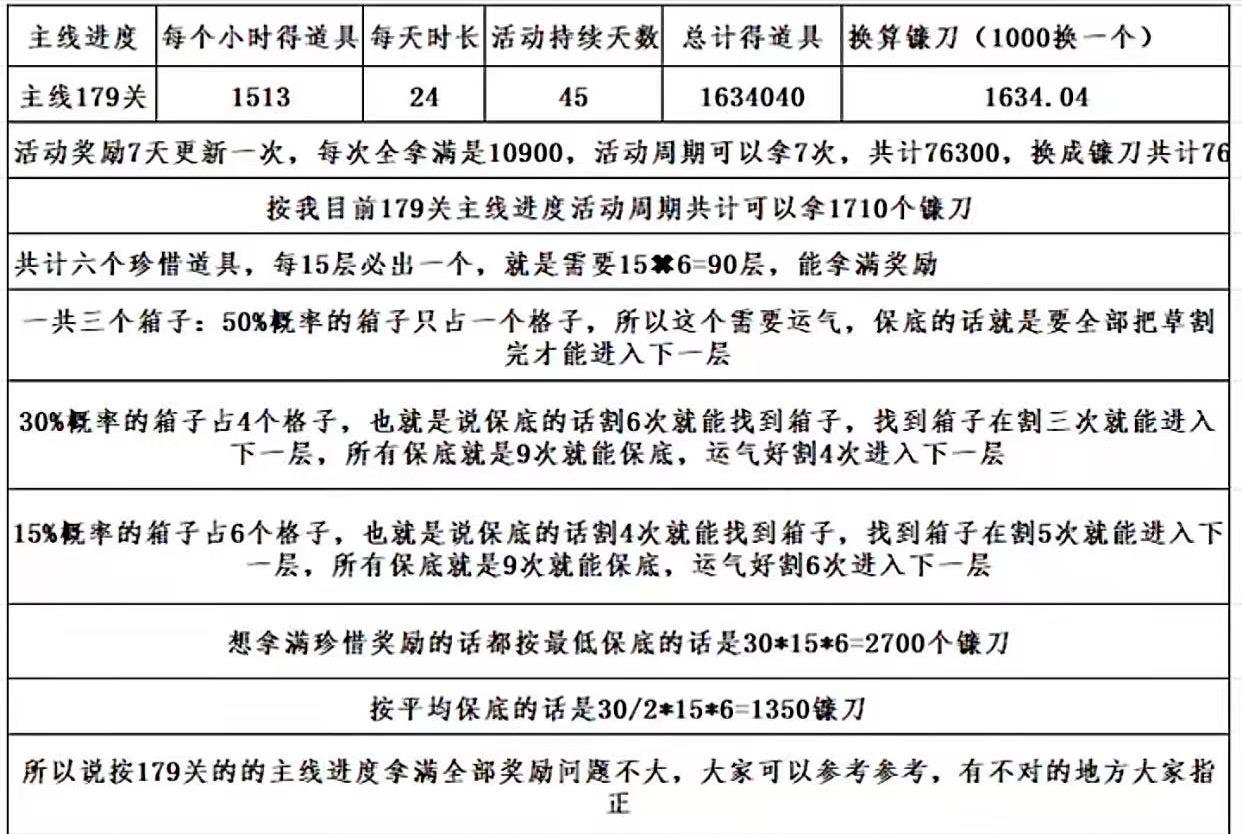 • 镰刀获取:1把镰刀需要1000个"风之尘"。固定任务每7天刷新1次,活动持续45天共刷新7次,全部做完可白嫖76把。此外,主线关卡越高,每小时获得的风之尘越多,活动期间可获得的镰刀数量也越多。例如,179关每小时获得1513风之尘,活动期间可获得1710把镰刀;274关每小时获得1969风之尘,活动期间可获得2126把镰刀。