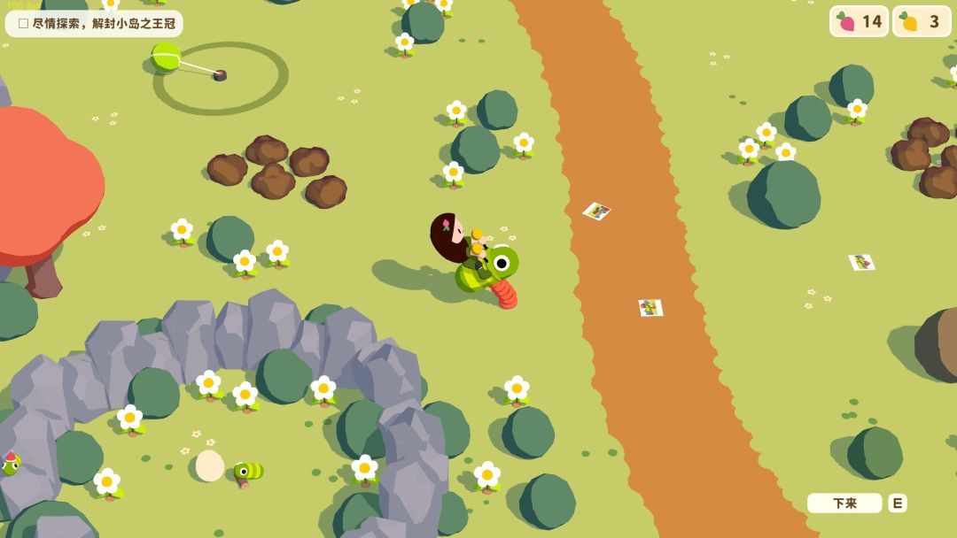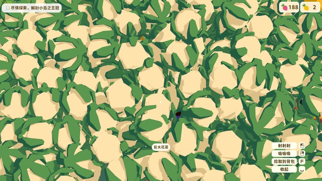 种地!作为拥有刻在DNA里的种田基因的中国人,一个拥有种地系统的游戏绝对我有巨大的吸引力,特别是玩出了花的种地。在本作中玩家可以种植萝卜、花菜等一系列农作物,浇水后长出成品然后拔!狠狠的拔萝卜!蔬菜可以换取硬币来开启扭蛋机(有些蔬菜不能收进背包需要放进小推车如番茄和南瓜)。游戏中的部分蔬菜还能种植成巨大作物,巨大胡萝卜、巨大番茄可以用来做衣服,巨大南瓜可以做推车和篮子。还有一个bug蔬菜花菜,一分一百直接给电脑上压力,一直增长吸都洗不完如同癌细胞一般,因此被玩家戏称为卡卡顿顿花菜时光。