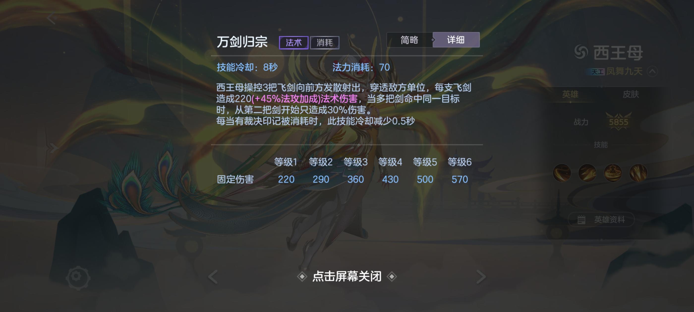 技能解析:西王母朝指定圆心发射三道飞剑,穿透所有敌人并造成伤害,同一个敌人受到多次伤害会有衰减。每一次标记的命中均会减少此技能cd。