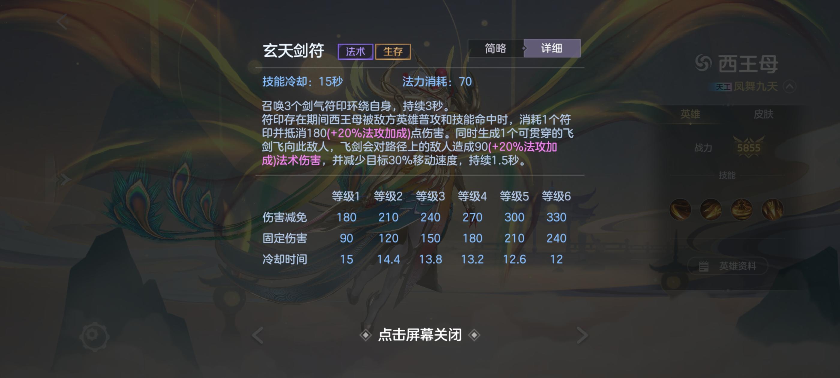 西王母召唤三道剑符,减少下次三次受到来自英雄和野怪的伤害,且受到上述目标伤害后,会向伤害来源方向发射一道贯穿所有敌人的剑气造成伤害和减速。剑符每0.3秒至多触发一次。