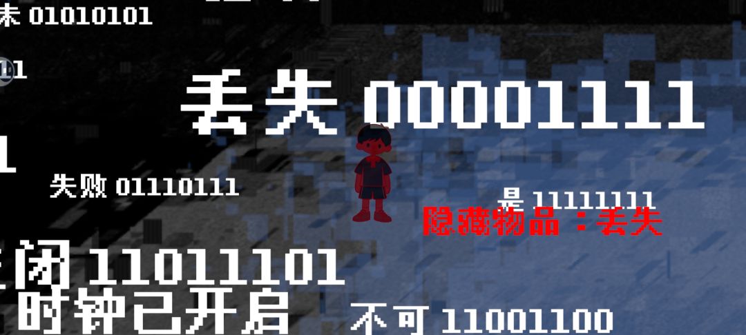 如果心电图答错就会进入bug场景,修复红色的字就能开启右边的门。修复方法很简单,比如隐藏物品丢失,背景有丢失是00001111,修改成11110000就修好了。左下角那个时钟原本是关闭的,我对照关闭是11011101给它输入00100010就修好了。但是修好就跳关了可能导致有些东西没来得及收集。