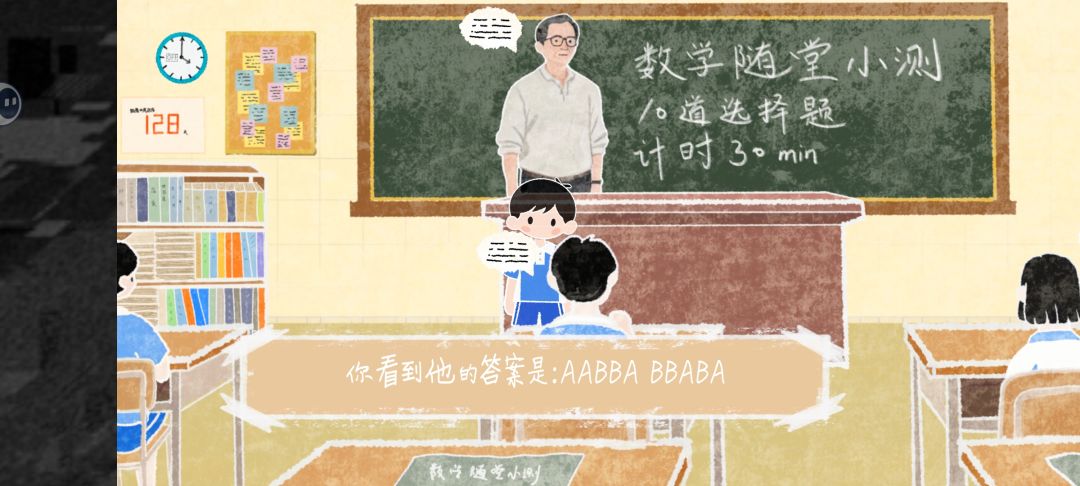 午休之后就是数学考试,这里走到左边,点击墙上的时钟就可以暂停时间去看别人的试卷。不暂停的情况下偷看会被抓。另外看到这个不要照抄,这个人是90分,错了一道题。答案在自己桌上的错题本里可以找到,里面有十句话,格式都是:
