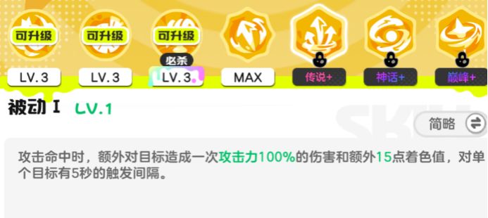 技能由普攻、黄条技能、必杀大招,以及多个被动构成,强化素材由颜料保卫战获取。