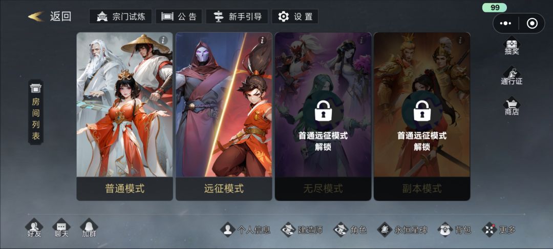 常规关卡挑战是普通模式,其他模式需要在主界面进入,包括远征、无限、副本模式,后二者需要解锁才能体验。
