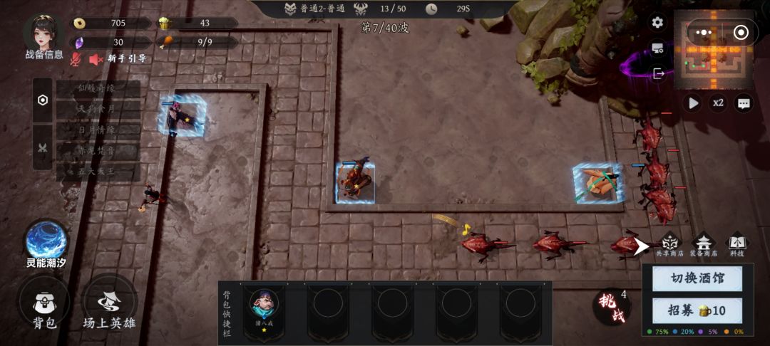 塔防的基础上融入了自走棋的设定,以关卡制进行游戏,一关内若干波次,当怪物总数超过一定数量才算失败,是容错率比较高的塔防模式。有人口的概念,每个棋子英雄所占人口有差别,大概是按品级来的,高品级所占人口数更多。战斗中可以通过积攒酒杯和金币来升级科技提升人口上限,有一定资源投入优先级策略。