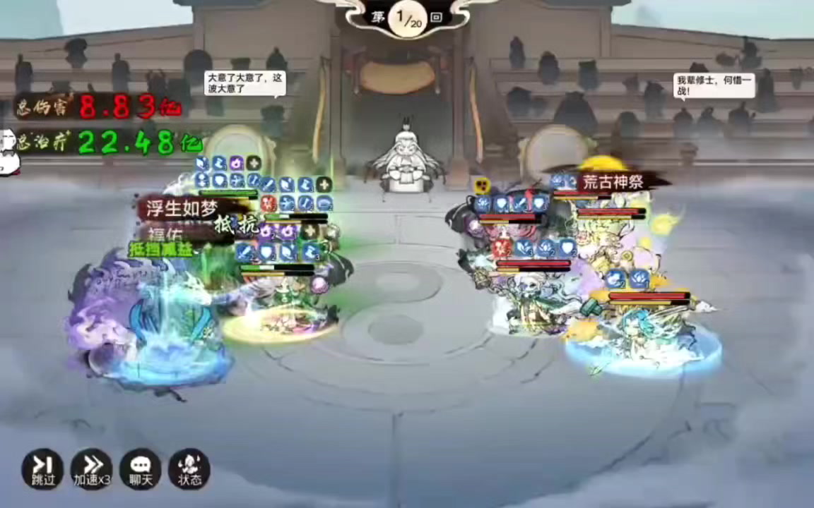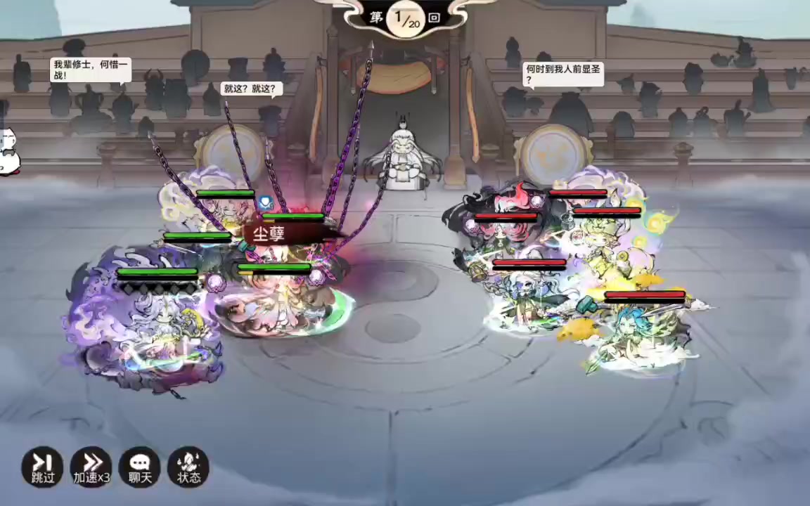 作者主要截取关键部分为大家展示该阵容的强势点,这样比较直观。可以看到,老李第一回合利用酒剑行和松风触发的斩仙剑煞获得再动,触发了两次大庚剑阵以及一次囚龙,第二回合在四阶羽毛,舞姬红天命,以及松风的被动效果下,放出了第二个囚龙,最终奠定了胜利的基础。于此同时,老李吃到了大荒,鸣金,玉箫以及松风四个增益功法,配合魔剑的被动,将输出拉到了最大化。仙老李就只能在铁桶阵容中等待时机去启动,而魔老李这套速攻阵容将老李的输出进程拉快,启动不再需要队友去拖回合数。