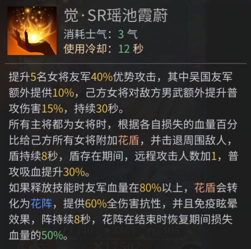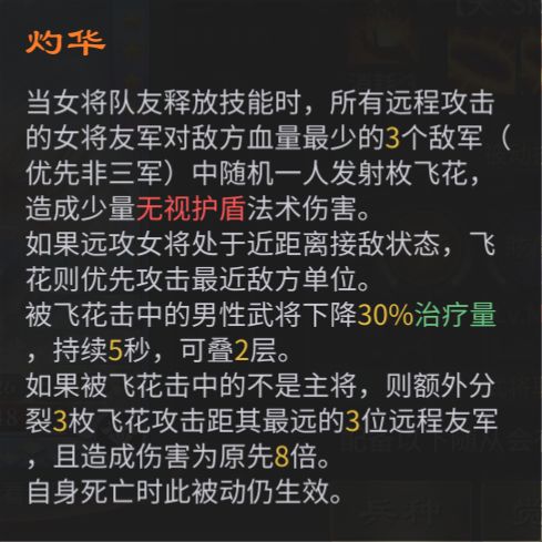 步练师的技能与女性友军密切相关,建议作为女队专属的buff将。其主动技能可大幅提升己方女性友军生存能力,前期释放时为队伍附加花阵效果,可以帮没有多少防御属性的队伍提供先手生存优势。也可以在血量较少的情况下坚持更久,并且此时有更强的攻击力。步练师的专属被动赋予其良好的补刀能力,且对敌方的炮灰角色有更强的伤害的效果,掌握好时机方可获得最大收益。作为策士弓兵武将,装备套装选择“龙吟”战魂选择:4“熊罴”+2“丹雀”