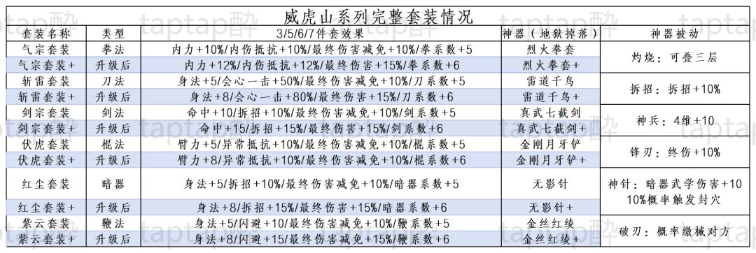 目前还算是游戏的主流搭配,毕竟7件套的系数还是很不错的提升。威虎山套装精英掉落金漆装备箱子开出剑形古币,威虎山地狱掉落鎏金装备箱子可开出剑形古币或者直接开出套装对应部位,集齐10个剑形古币通过平安镇中心悦来客栈的偶货商兑换,随机开出套装装备。对应部位套装分解可获得相应的花纹银币,集齐10个可向偶货商兑换自选对应部位套装箱子。