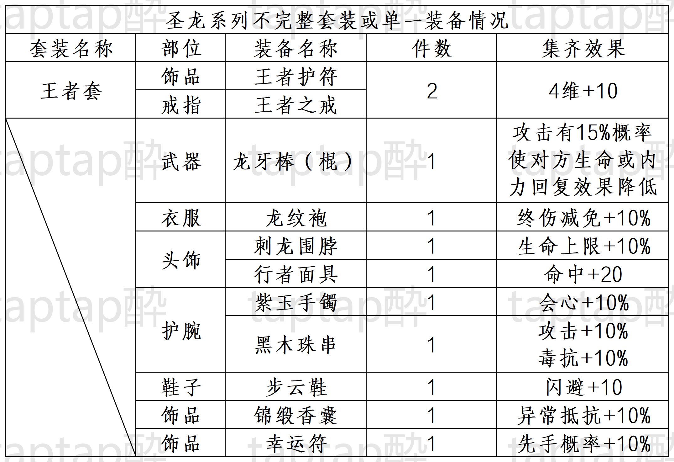 圣龙也是标志着散件玩法的开始,通常是千百玩家通过同心套装、龙纹袍和刺龙围脖达成不可思议的面板血量,不过其实也只有这个武学搭配适配了,其他都是纸老虎啦。