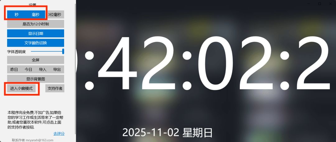 (1)安装完毕后,打开应用,在时间文字上右键打开设置,选择显示毫秒,最后将其设置为小窗模式。