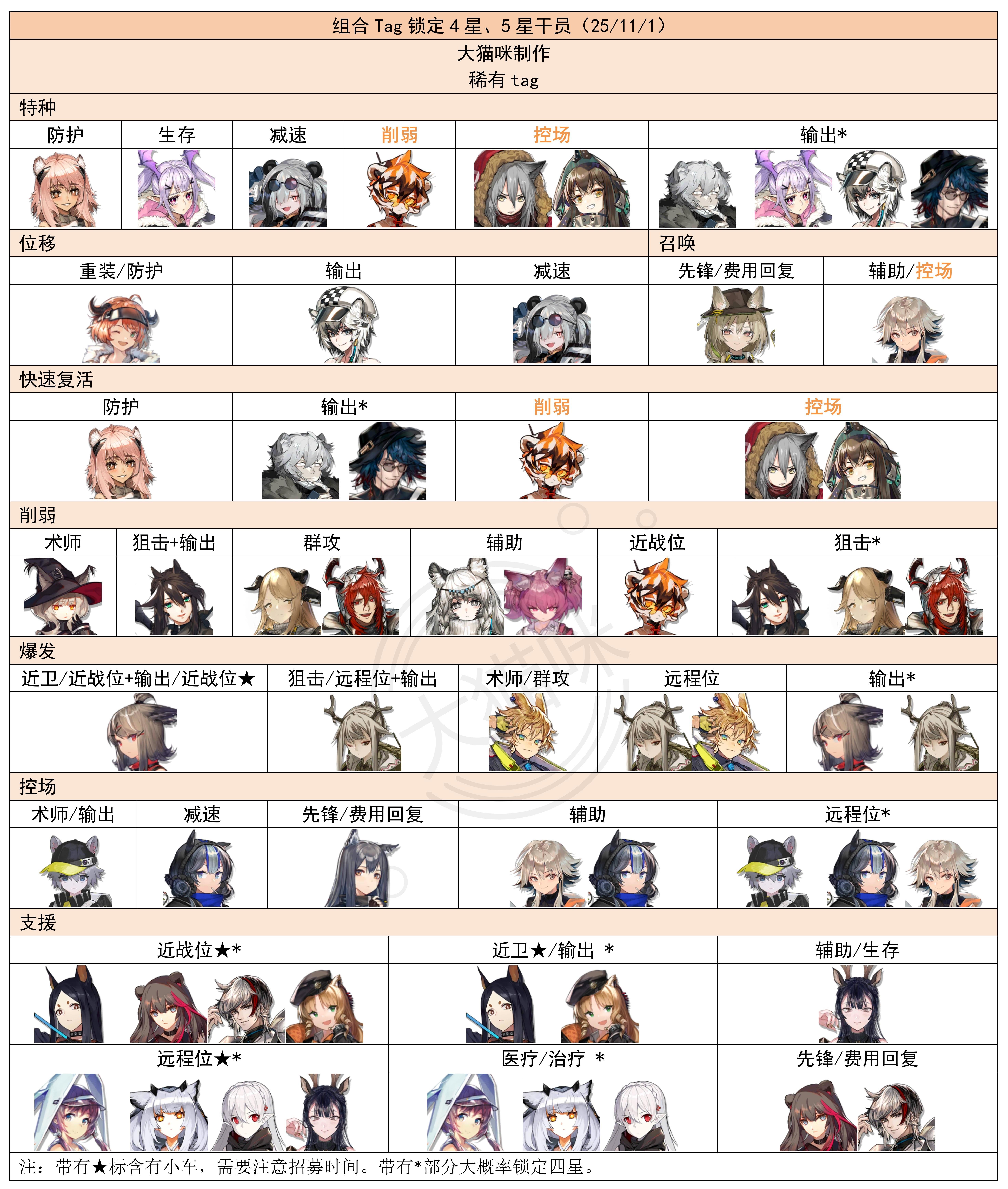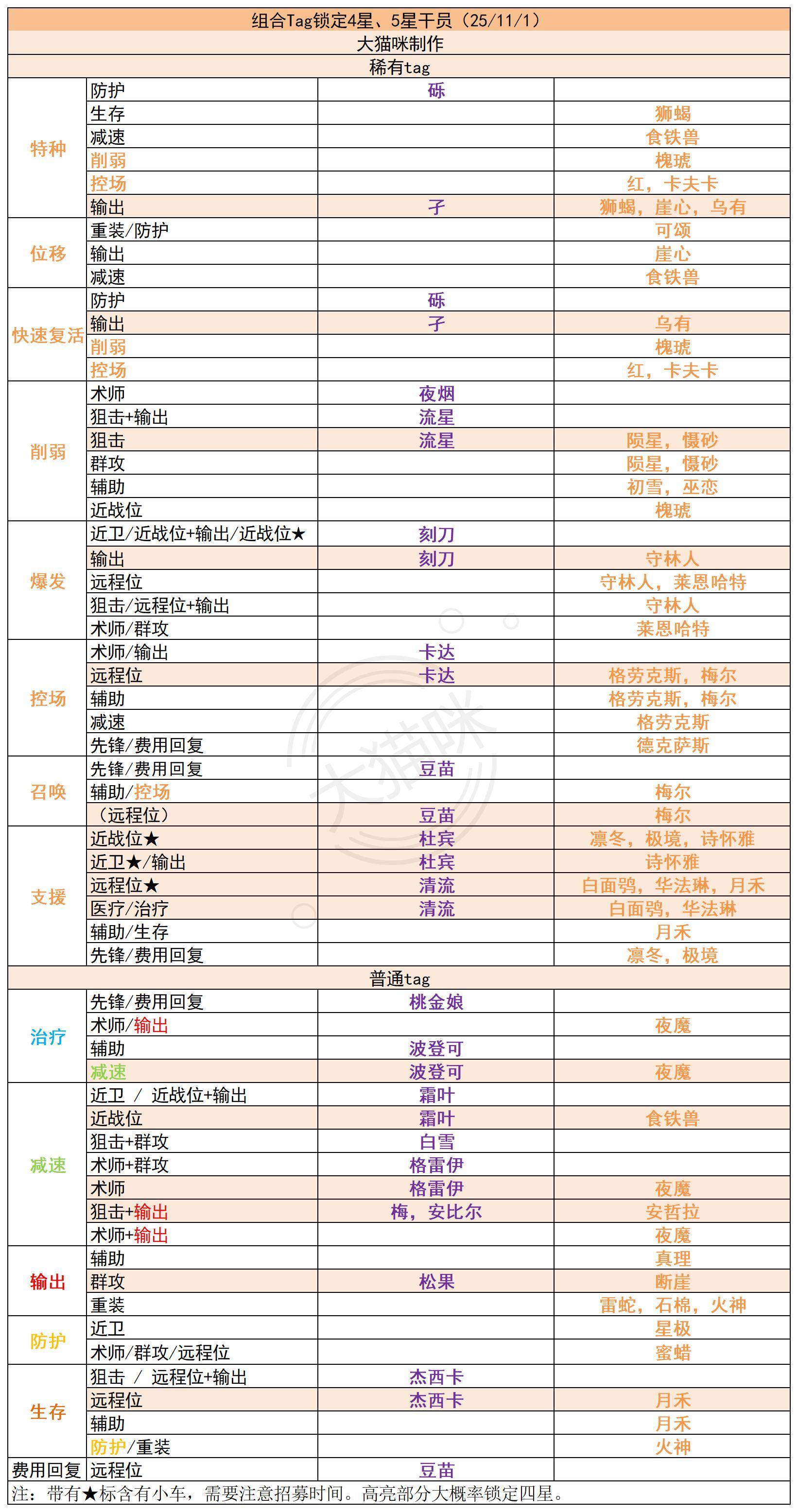(注:部分干员不是100%获得;组合Tag对应多名4星、5星干员的Tag没有列入)
