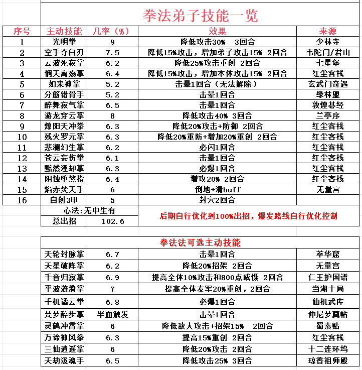 本帖目的是以高性价比获取尽量高的有效出招,一表有些武学拿不到,那就从备选挑选代价小的先填充,先有再精。每个图每个怪都有一些配置差别,现在的版本答案是瓦岗、波4,等个人到达之后呢,那时候的版本答案是什么?后面自己会玩了,再根据自己的路线和资源选配吧。