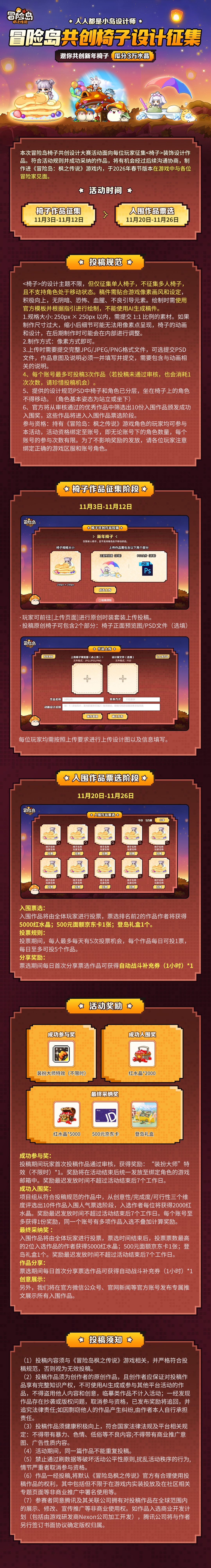 本次冒险岛椅子共创设计大赛活动面向每位玩家征集<椅子>装饰设计作品。符合活动规则并成功采纳的作品,将有机会经过后续沟通协商,制作进《冒险岛:枫之传说》游戏内,于2026年春节版本在游戏中与各位冒险家见面。