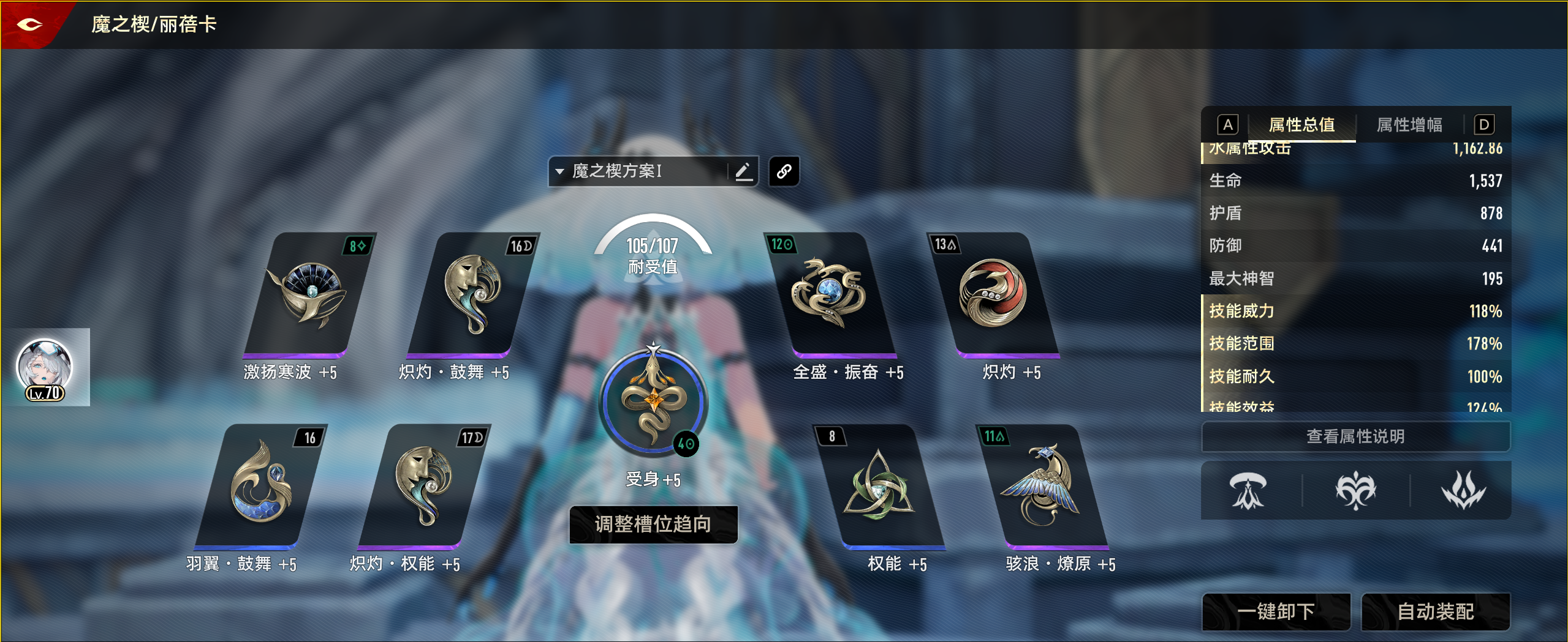 丽蓓卡前期先把攻击力相关的全都放上去,解锁30级的【夜航手册】后,把技能效益相关的魔之楔:牧神之鼓舞‧散碎和消逝给刷出来,