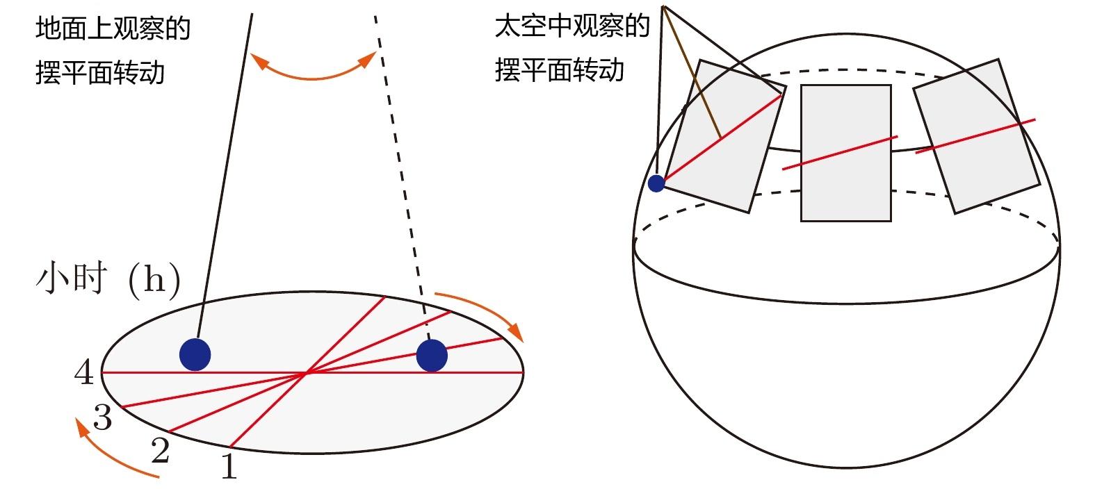 在无外力推动下,单摆摆动时,摆动平面理应保持不变,但因为地球的自转运动,在长时间后,可以发现单摆的摆动平面在缓缓转动。