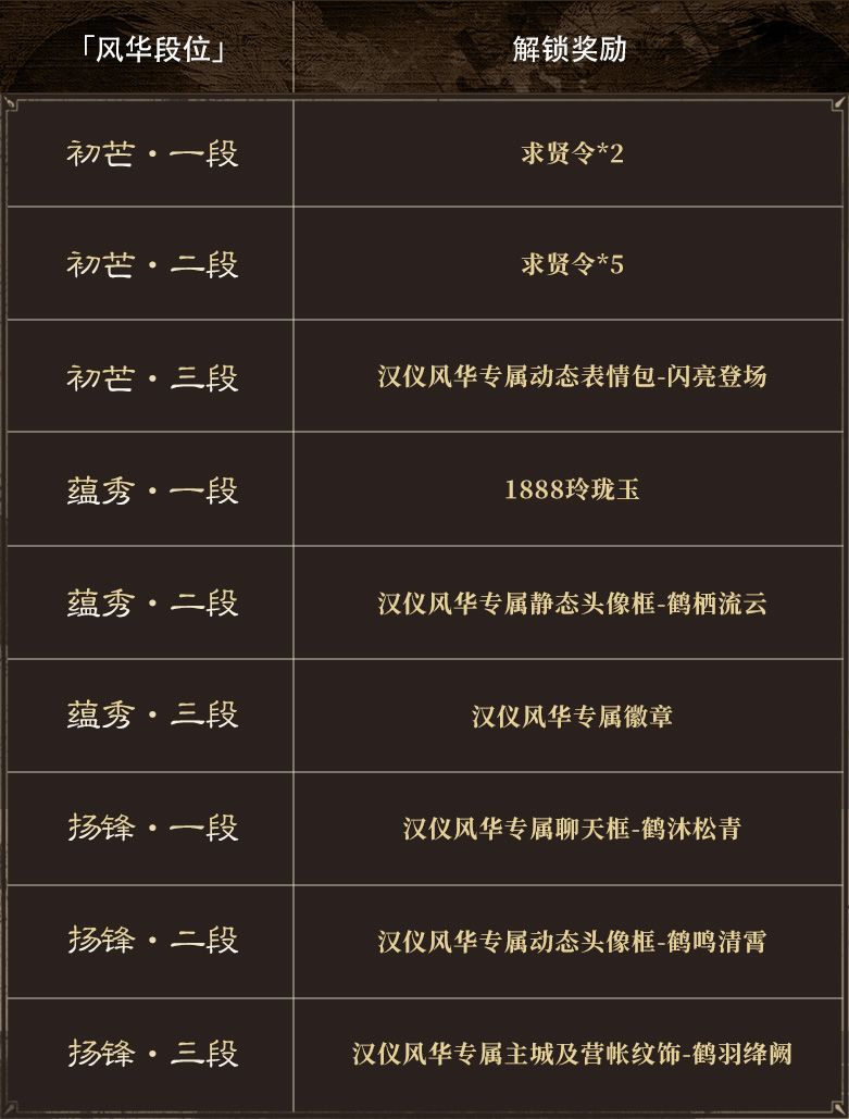 「风华总值」将在您的个人主页外显,根据不同的「风华段位」,主公可在「汉仪风华」内领取对应的专属奖励: