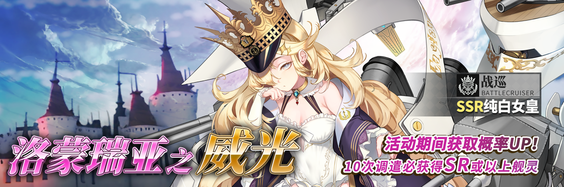 指挥官可通过「紧急调遣证」在「洛蒙瑞亚之威光」活动调遣中获取限定SSR舰灵「纯白女皇」,且该角色的获取概率将在活动期间大幅提升!具体概率将在游戏内公示。