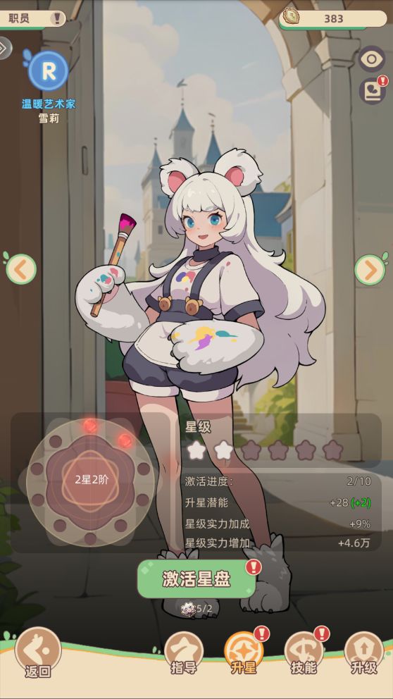 一般为6个星级,品质越高的职员,拥有更高的升星上限。每星级分为10阶,每达到10阶需消耗潜能药水进行觉醒。升星可以提升职员潜能和实力加成。