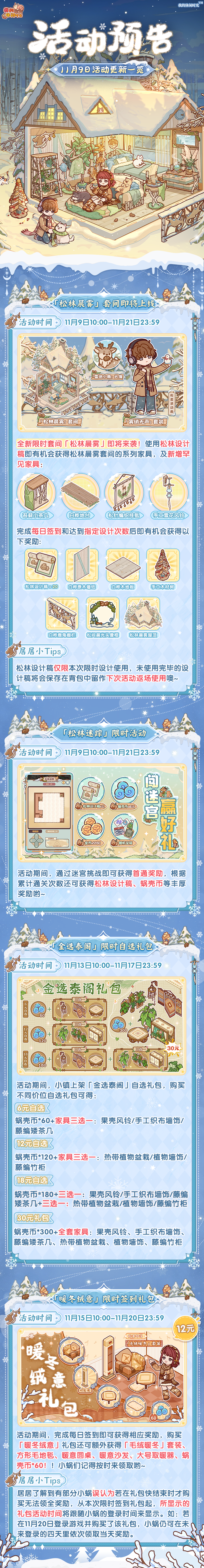 ❄️限时活动「松林迷踪」即将开启!参与活动即有机会获得松林设计稿*11、蜗壳币*615等奖励!更有全新限时自选礼包「金选泰阁」、签到礼包「暖冬绒意」即将上架,感兴趣的小蜗千万不要错过哟~