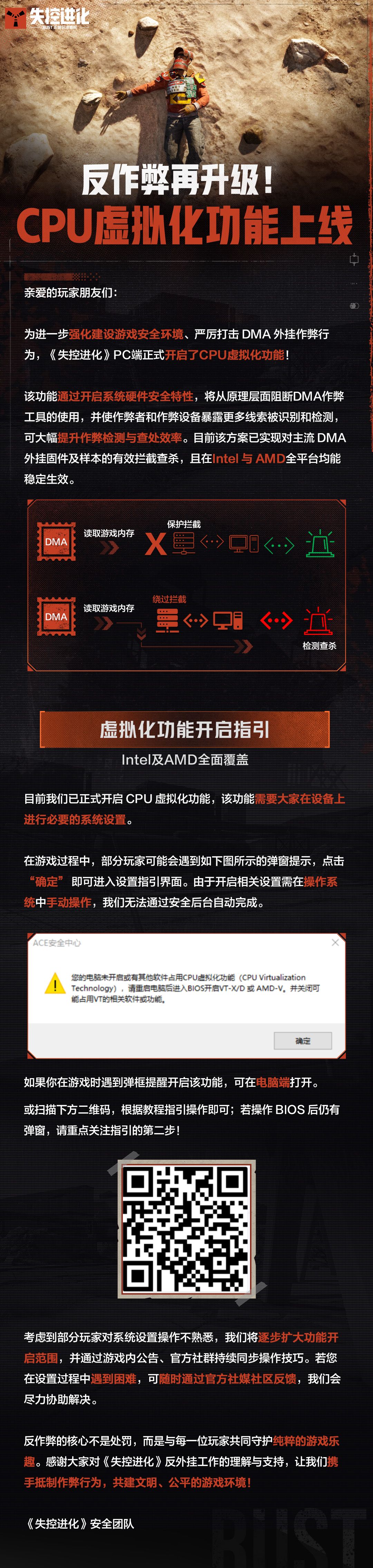 为进一步强化建设游戏安全环境、严厉打击 DMA 外挂作弊行为,《失控进化》PC端正式开启了CPU虚拟化功能!