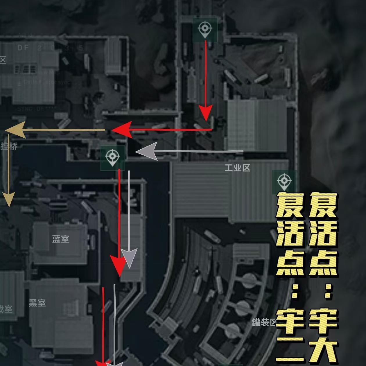 很多宝宝看到复活开局在牢大这里时会感到非常难受,无需多言,我们先来沙地架狙看一下二员位置有无情况,二员通过之后刷卡点一段时间后直接尾随(如果二员没有刷卡我们直接在沙地继续架狙,也可以选择而从中控桥下方滑索通过),随后走水房这边直接安全上桥,不过遇到二员打牢大这边的情况还是直接下一局吧。在工业区牢二点位开局的宝宝和牢大的路线基本一致,观察二员是否开卡的同时,一定要看一下沙地的情况,确认安全无误之后再上桥。