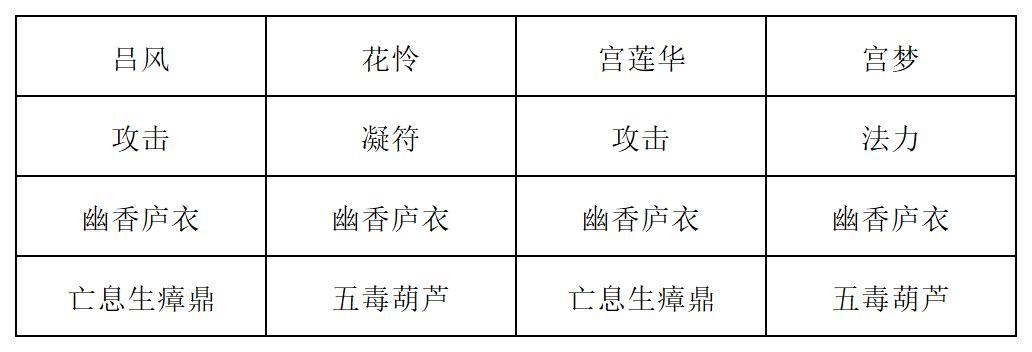 开局打出宫梦的悠长和清风咒,接着打出花怜的毒藤咒和宫莲华的摄魂和裂木决,接着打出花怜的玄天生长符,然后吕风复制玄天生长符,保证毒量最大化,然后宫莲华接毒斩,宫梦接葬花。